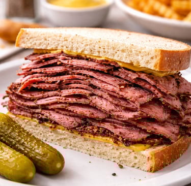 Ingredients: Brisket, curing spices, rye bread, pickles, yellow mustard.