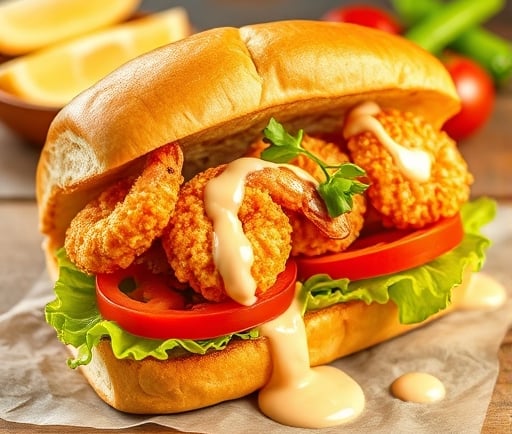 Once everything is ready, spread a generous amount of remoulade sauce inside the baguette, layer in the fried shrimp, and top with crisp lettuce and slices of juicy tomatoes. This easy-to-make shrimp po' boy sandwich is perfect for a quick lunch or a casual dinner, delivering a delightful burst of flavors with every bite. Enjoy your creation with a side of fries for a classic South Louisiana experience!