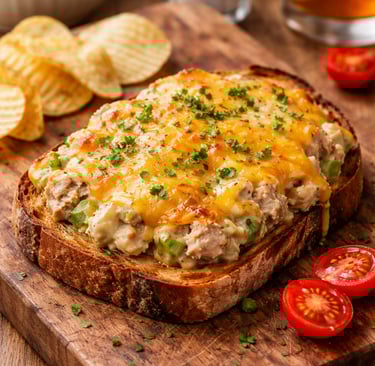 The open-faced tuna melt is a creative take on the original sandwich. In this preparation, the bread is laid flat and isn't completely covered, allowing melted cheese and tuna to be artistically displayed. Typically, a slice of hearty sourdough or rustic bread serves as the base. The tuna salad is prepared in the traditional manner, often mixed with mayonnaise, celery, and spices, then topped generously with cheese. After assembly, it is placed under a broiler until the cheese is bubbly and golden. The open design offers a delightful texture contrast between the crunchy bread and the creamy tuna, providing an attractive presentation that is perfect for casual dining or entertaining.